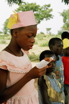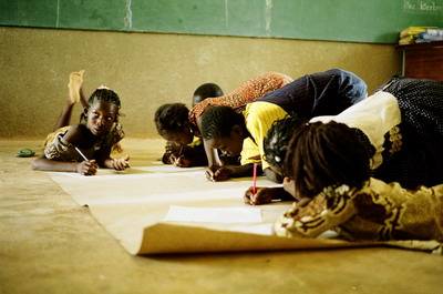 Durant les deux semaines, nous avons accueilli dans les locaux de l’école deux fois 40 enfants de 8 à 14 ans, chaque groupe pour une semaine. Le premier jour fut très stressant, car il est difficile d’entrer en contact avec ces enfants. De plus, trois d’entre nous n’avaient aucune expérience d’activités avec des enfants ; les deux autres n’étaient d’ailleurs pas plus avancés, car la différence de culture entre les enfants africains et les européens est énorme. Heureusement, les instituteurs nous aidaient et nous ont guidés, car seuls, nous n’y serions jamais arrivés.